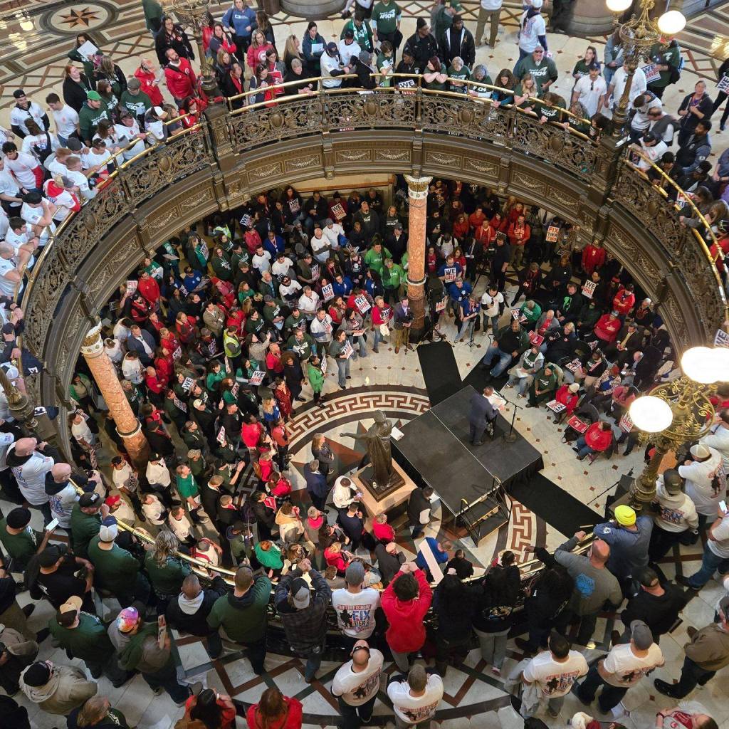 Thousands gather in the largest rally at the Springfield Capitol Building. Representatives from each of the major public sector unions speak to encourage lawmakers to act.